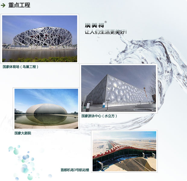 國(guó)家體育場(chǎng)(鳥(niǎo)巢工程) 國(guó)家大劇院 人民大會(huì)堂 北京奧林匹克體育中心 北京長(zhǎng)城飯店 北京三零一醫(yī)院 北京中日醫(yī)院 央視新大樓 |